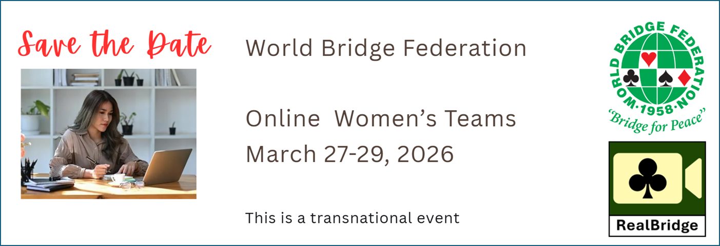 The WBF Women’s Committee is pleased to have found a date for our 3rd WBF Online Women’s Teams. The date of March 27-29, 2026 seems suitable for many women across the globe and we are announcing it now so as to give women time to schedule and prioritise in their bridge planning for 2026.