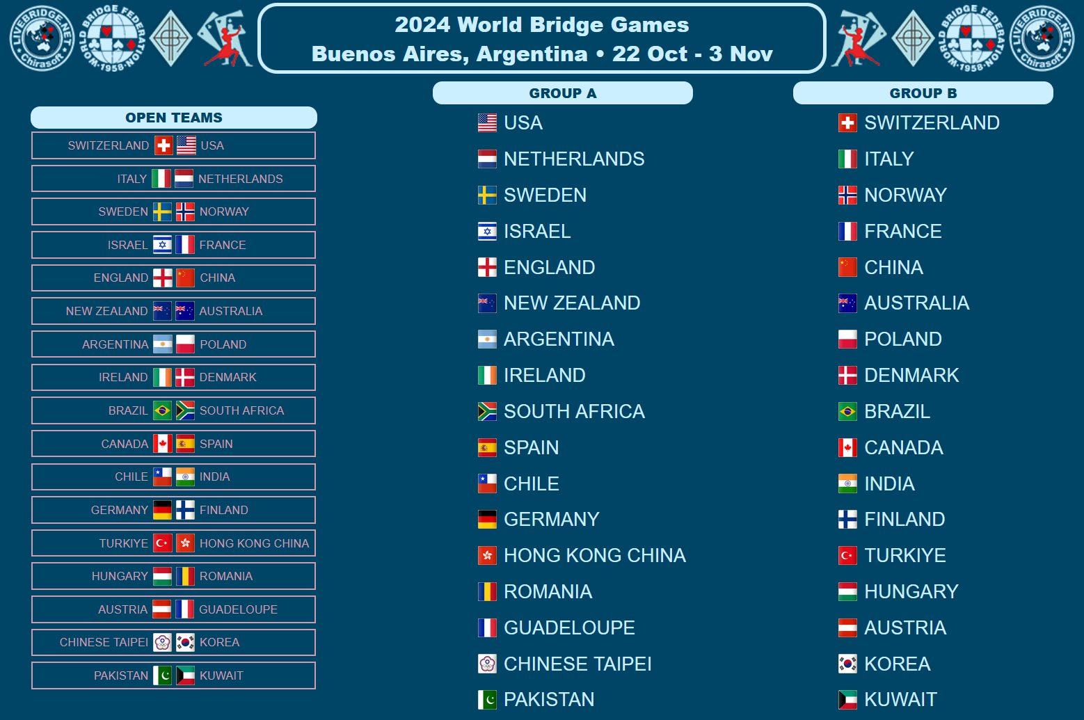 The Open Category of the 2024 World Bridge Games – Open Teams comprises 35 teams and will be split into two groups for the qualifying stage. There will be a full Round Robin played within each group, and the top 8 teams from each will qualify for the KO-stage. As set out in the Supplemental Conditions of Contest, and for the first time, we made a public draw to determine the composition of each group, FIFA/UEFA-style